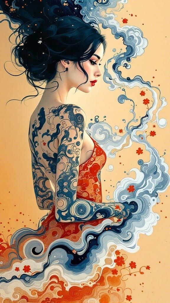 This serene image features a woman in vintage attire, with tattoos and a delicate floral skirt, set against a warm minimalist backdrop. The artwork showcases suminagashi marbling techniques, with intricate, flowing patterns in traditional Japanese colors, evoking a sense of meditative calm.