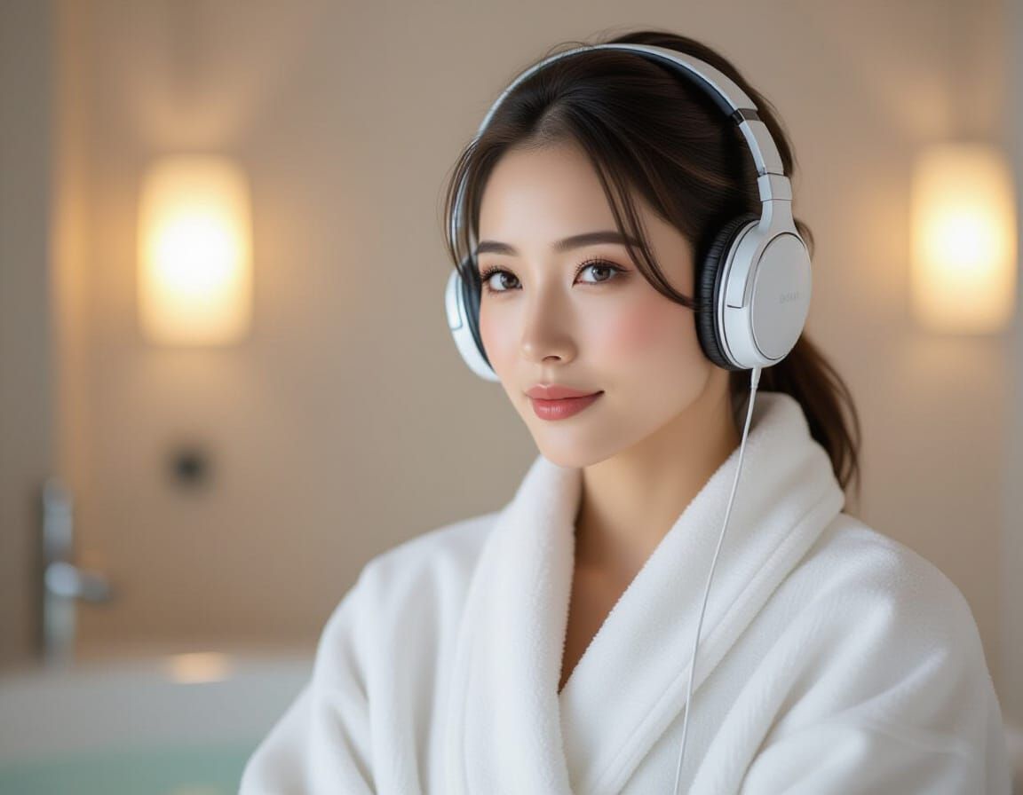 This photorealistic studio portrait shows a beautiful Japanese woman in a white bathrobe, wearing headphones and enjoying music. Features cinematic lighting and shallow depth of field.