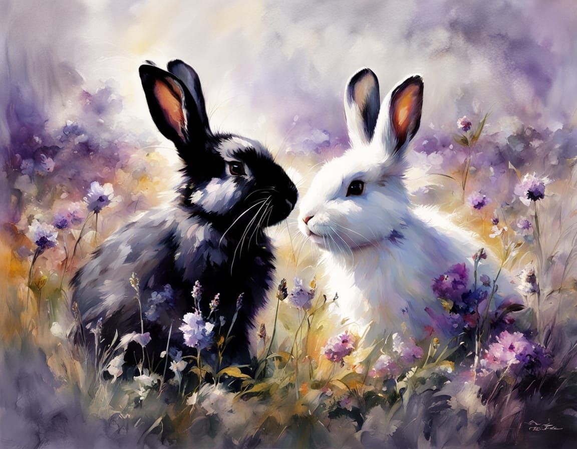 This image shows two adorable, fluffy black and white bunnies amidst a colorful field of purple flowers under bright sunshine. The scene is detailed with a painterly aesthetic.