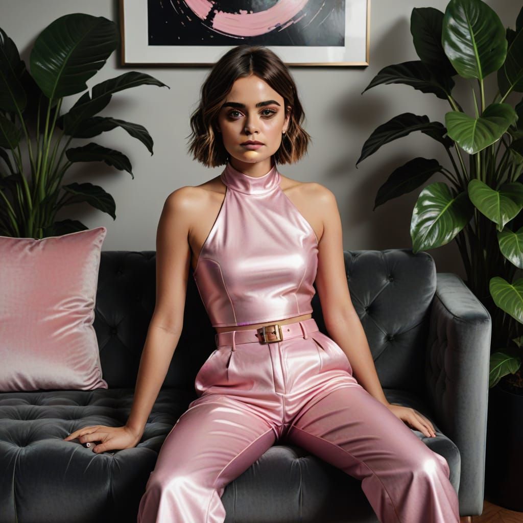 Iβm publishing a whole series of these pictures for two reasons. Firstly, because @Pretty_In_Pink said she wanted to see more. Secondly, as an illustration of how many different results from a single prompt you can get. The variations in the results from exactly the same prompt were surprising and really interesting. Not a single picture provided everything I asked for. My key requests in the prompt were: 1/ Full-length shot. 2/ Happy, smiling. 3/ Laying on a grey sofa in a cosy apartment. 4/ Short haircut dyed pink. 5/ High fashion image. 6/ Edgy, Avant Garde. 7/ Pink halter neck top and shorts. 8/ Mug of coffee and plate of toast. 9/ Vogue inspired pose. 10/ Houseplants. Books. Art. Photos.
