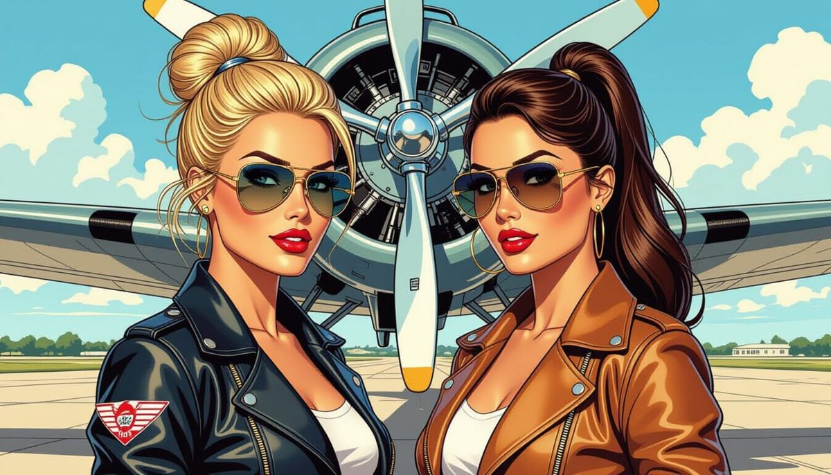 A color illustration of two beautiful women pilots in front of a vintage airplane. The artwork evokes comic book art with smooth lines and stylish attire, reminiscent of classic pin-up art.