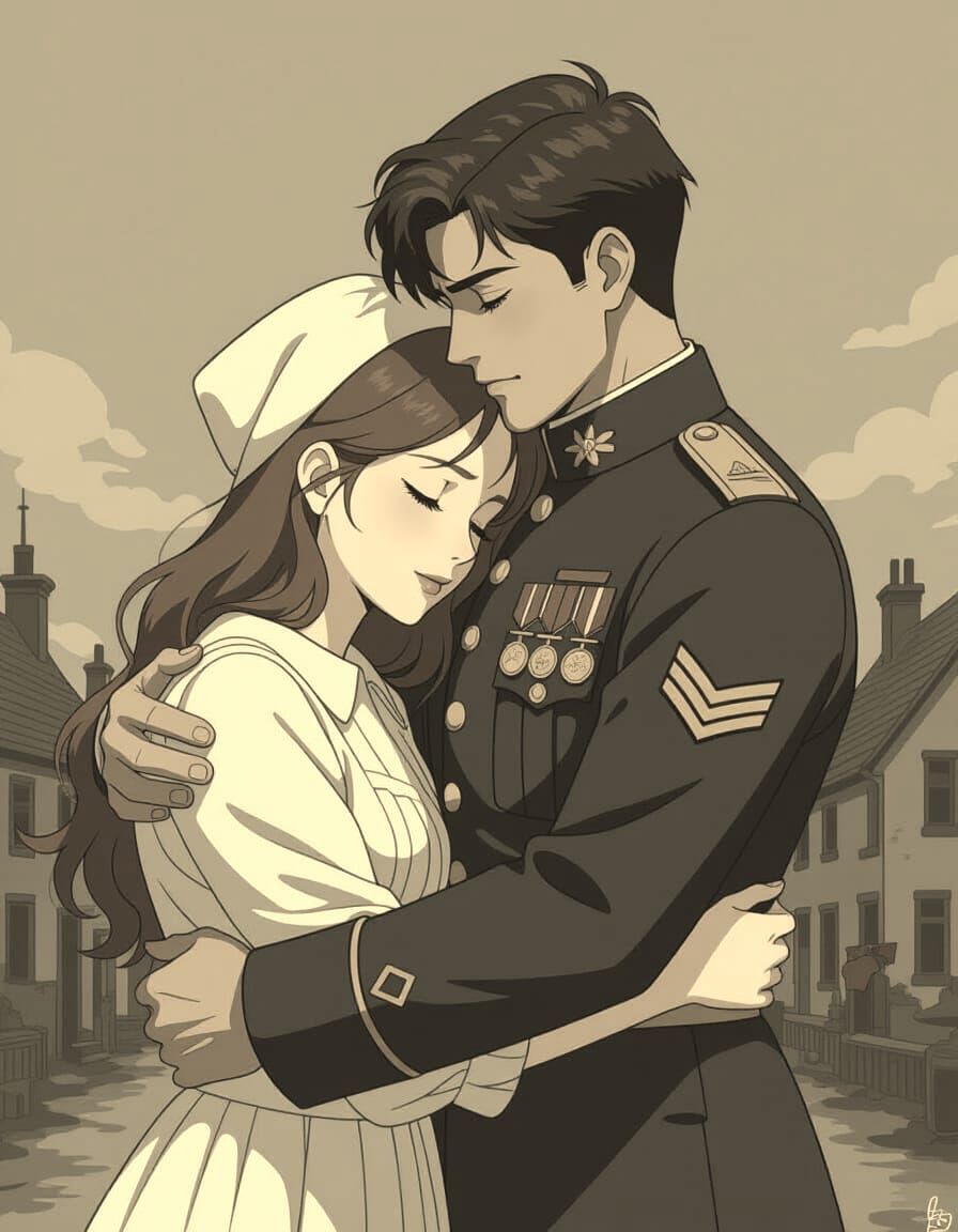 This image shows two lovers embracing during World War I. The illustration is cel-shaded with rich colors and fine details, in a vibrant manga style reminiscent of Studio Trigger.