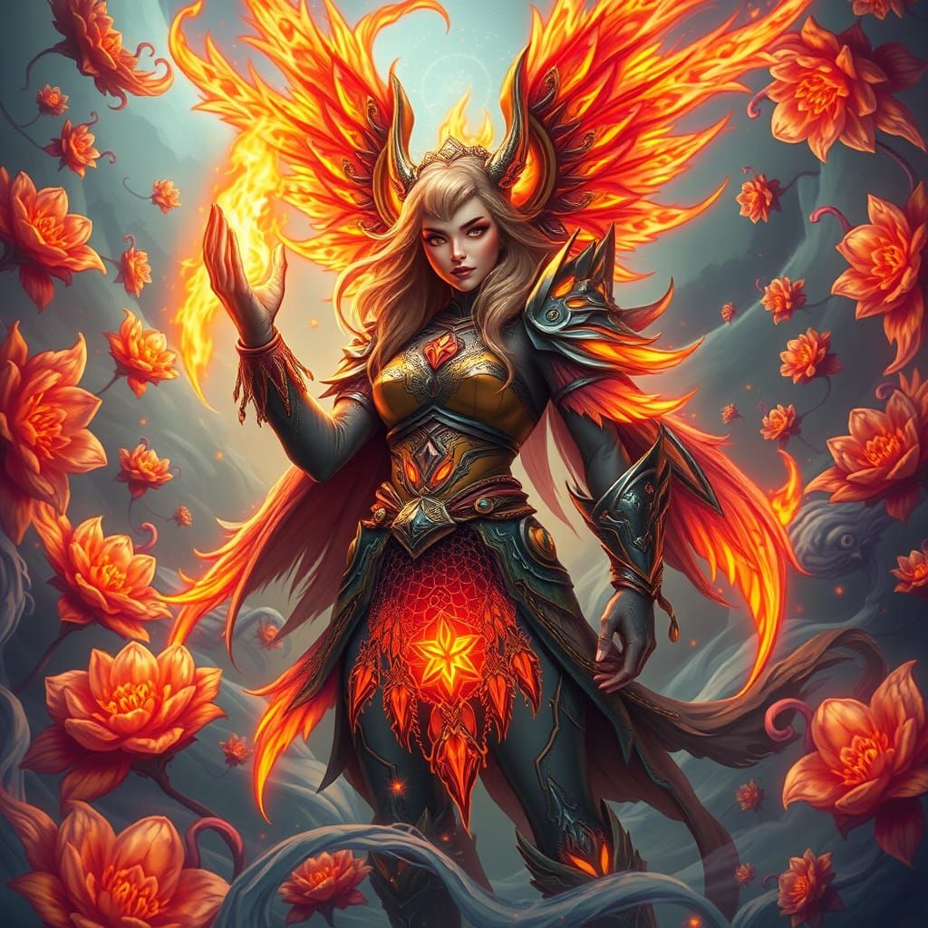This image shows a heroic paladin amidst a whirlwind of mutated florals, surrounded by flames and intricate biomechanical details, evoking a sense of otherworldly wonder and kinetic energy.