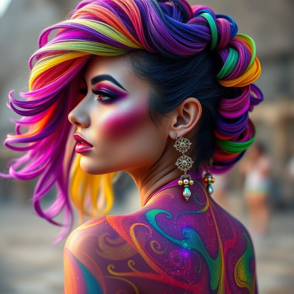 This vibrant image features a stunning woman with intricately styled rainbow hair, bold makeup, and elaborate neon body paint, set against a soft, blurred background with a dreamy quality.