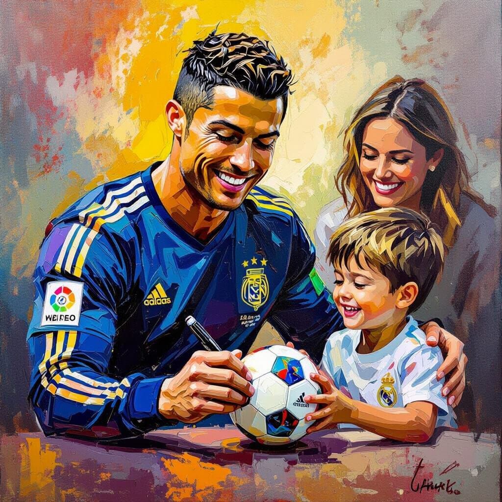 A vibrant oil painting in an impasto style shows Cristiano Ronaldo smiling while signing a miniature football for a delighted young boy. Energetic colors and textured strokes capture the emotional moment.