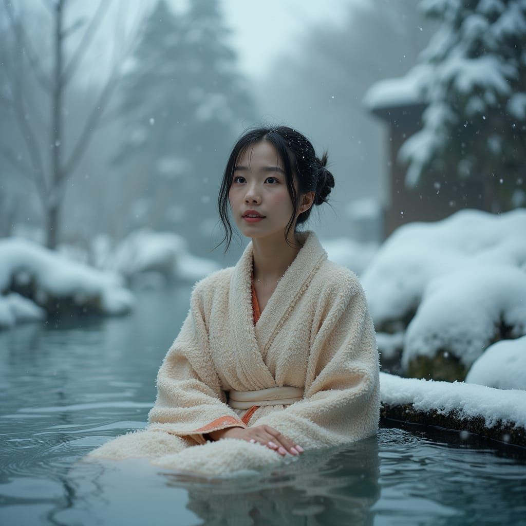 A captivating image of a 20-year-old Taiwanese woman relaxing in a snowy onsen. The scene evokes soft, ethereal lighting and delicate textures in a tranquil, dreamlike aesthetic.