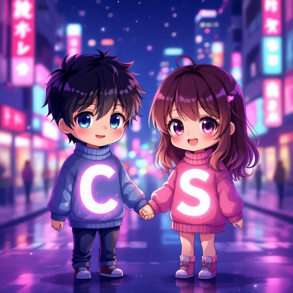 This image shows a chibi anime couple holding hands in a vibrant, neon-lit city at night. They wear glowing sweaters with the letters C and S, rendered in a pastel color palette.