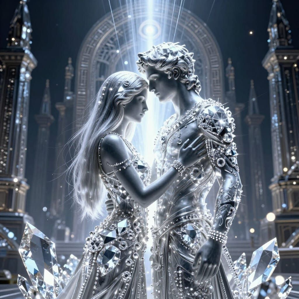 michelangelo paintings style : statue guy in glowing crystal diamonds vertex with enlaced beautiful armenian woman with ultra straight hair, shy, couple very connected spiritual, only bicromic, silouette, city of shamballah in background with, third eye chakra,, ray of lights between characters, ultra ...
