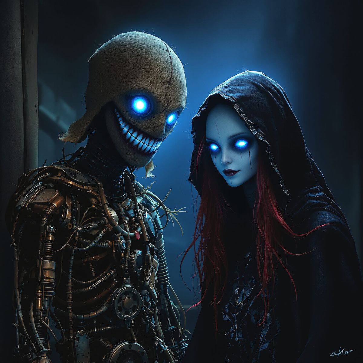 A digital painting of a scarecrow-like couple in a dark, rustic setting. Features steampunk elements and a cracked porcelain doll face, with dramatic lighting and decaying textures.
