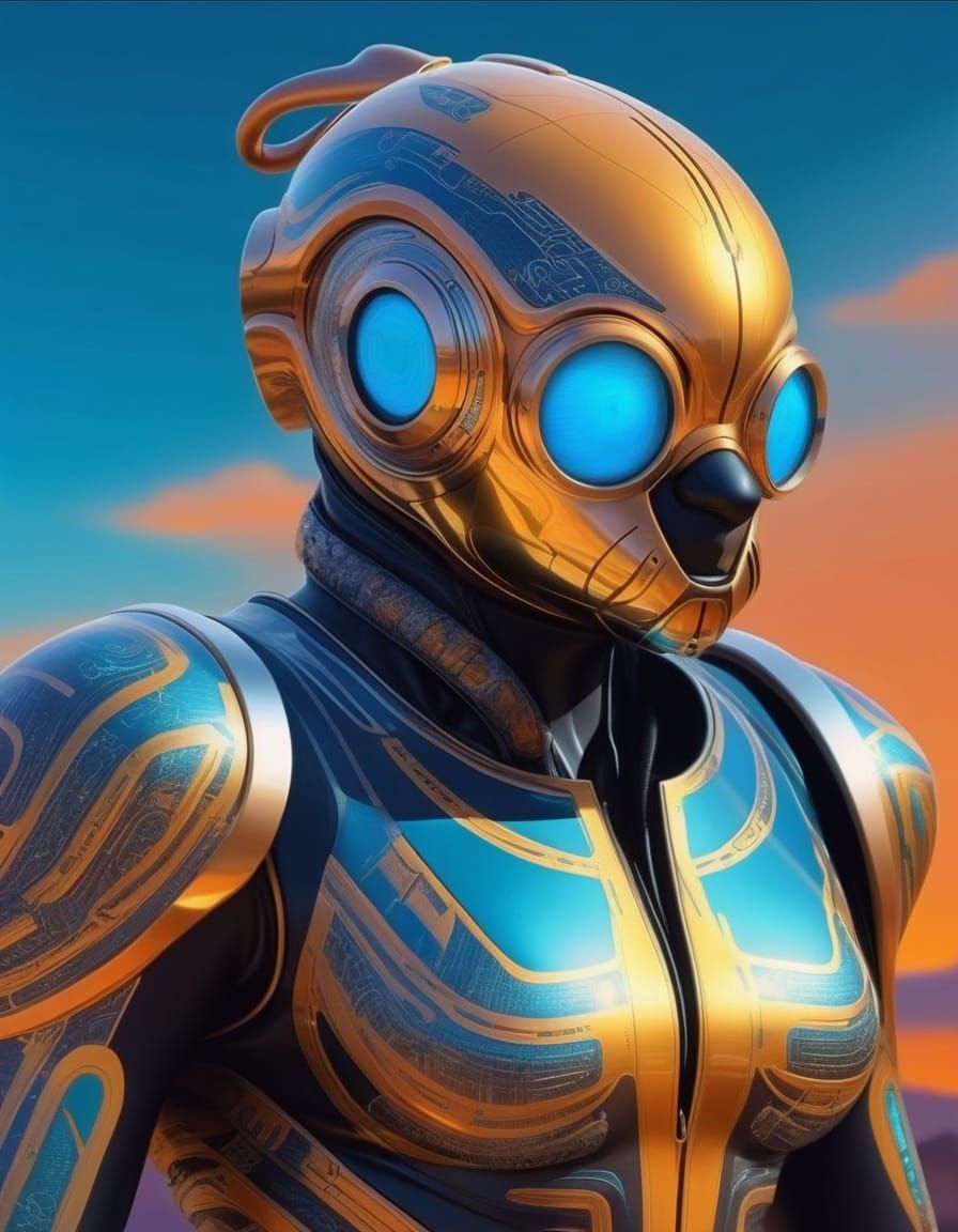 This image showcases a hyperrealistic, cinematic portrait of a futuristic diving suit with intricate metallic accents and glowing blue circuits, captured in warm, golden hour light with deep shadows and stunning detail.