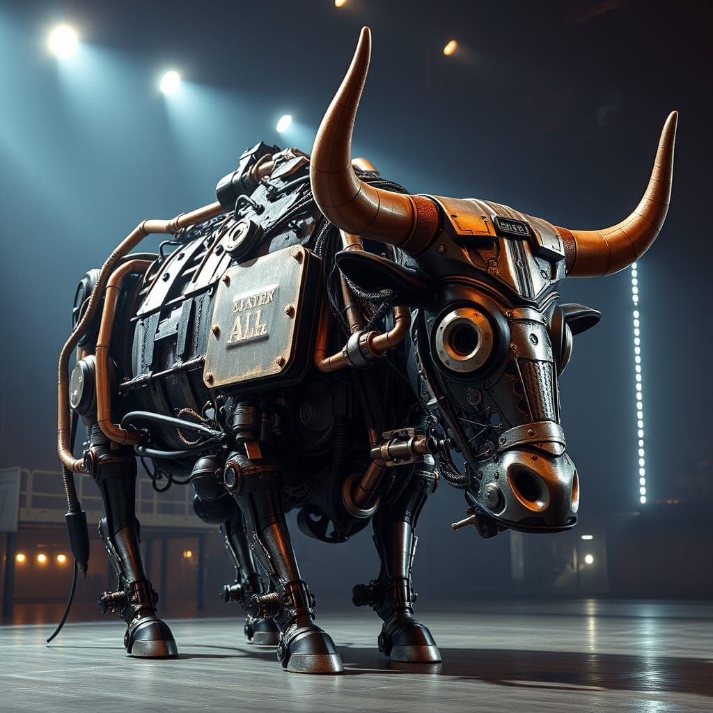 This image depicts a massive, biomechanical bull with a metallic exoskeleton, copper pipes, and intricate gears, set against a dramatic, high-contrast backdrop with bold lighting, evoking a sense of futuristic, industrial landscapes