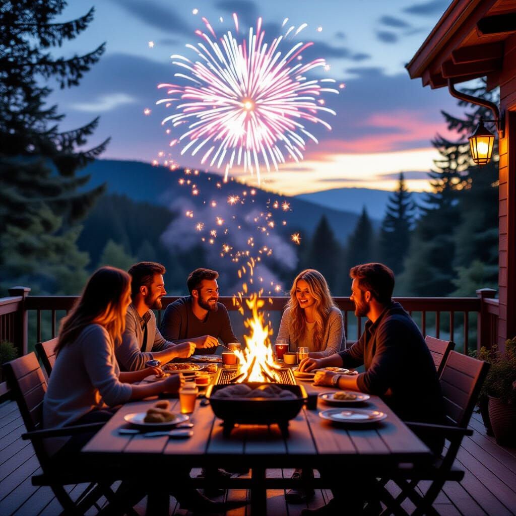 This image shows friends enjoying a barbecue on a deck with a forest view as fireworks light up the sky. This cinematic still features dramatic lighting and atmospheric depth.
