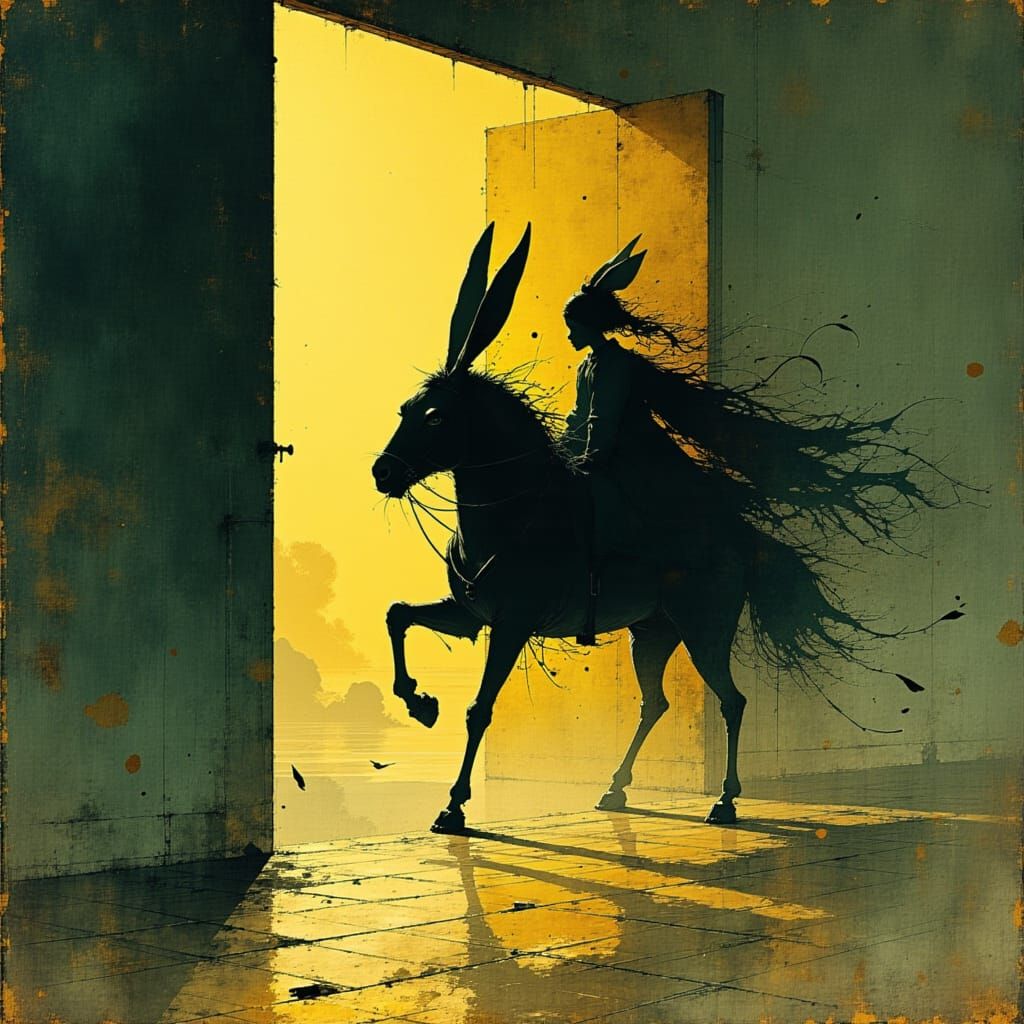 This image shows a giant Trojan Horse shaped like a rabbit, poised to enter an open door. Rendered in a dynamic, illustrative style with dramatic lighting, it evokes a sense of whimsical chaos and pursuit.