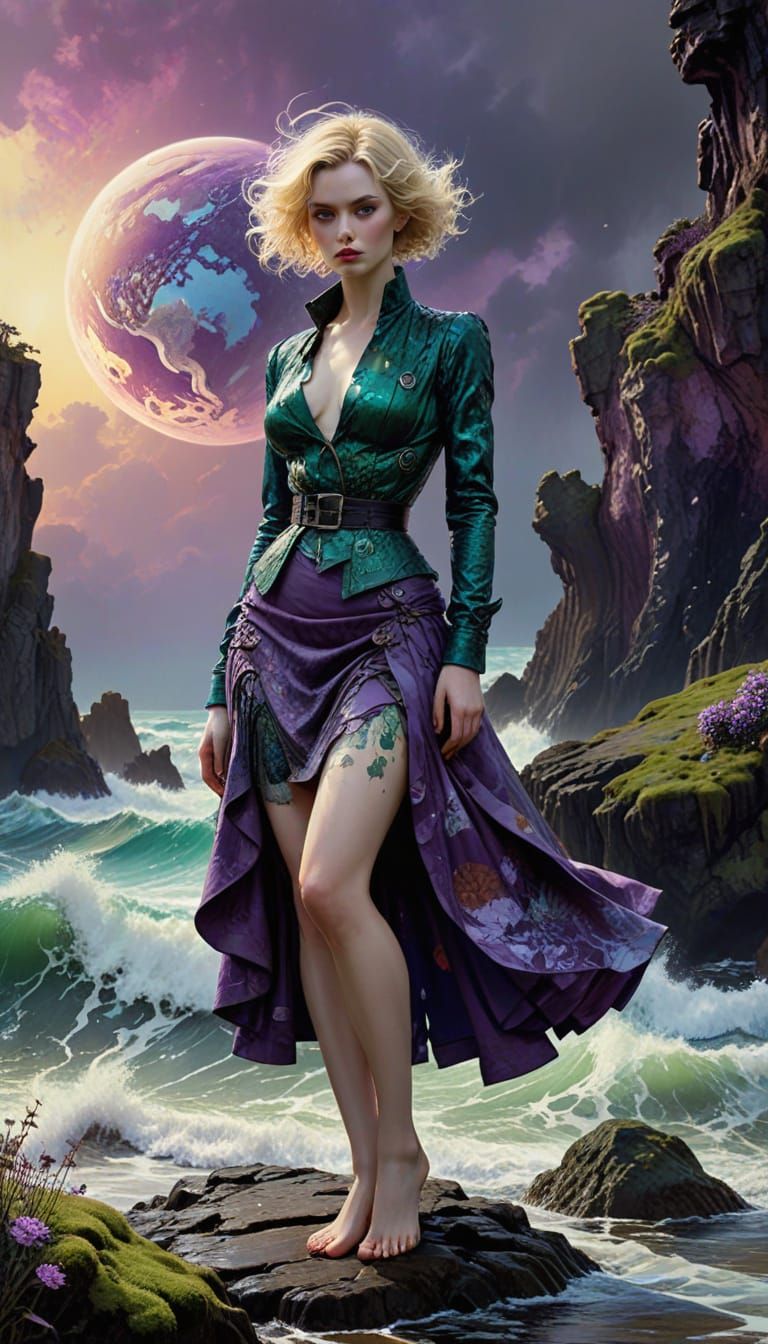 A striking picture of a vintage-style pin-up woman standing on a weathered, overgrown planet Earth. This digital painting blends expressionist techniques with elements of naturalism and harmonious colors.