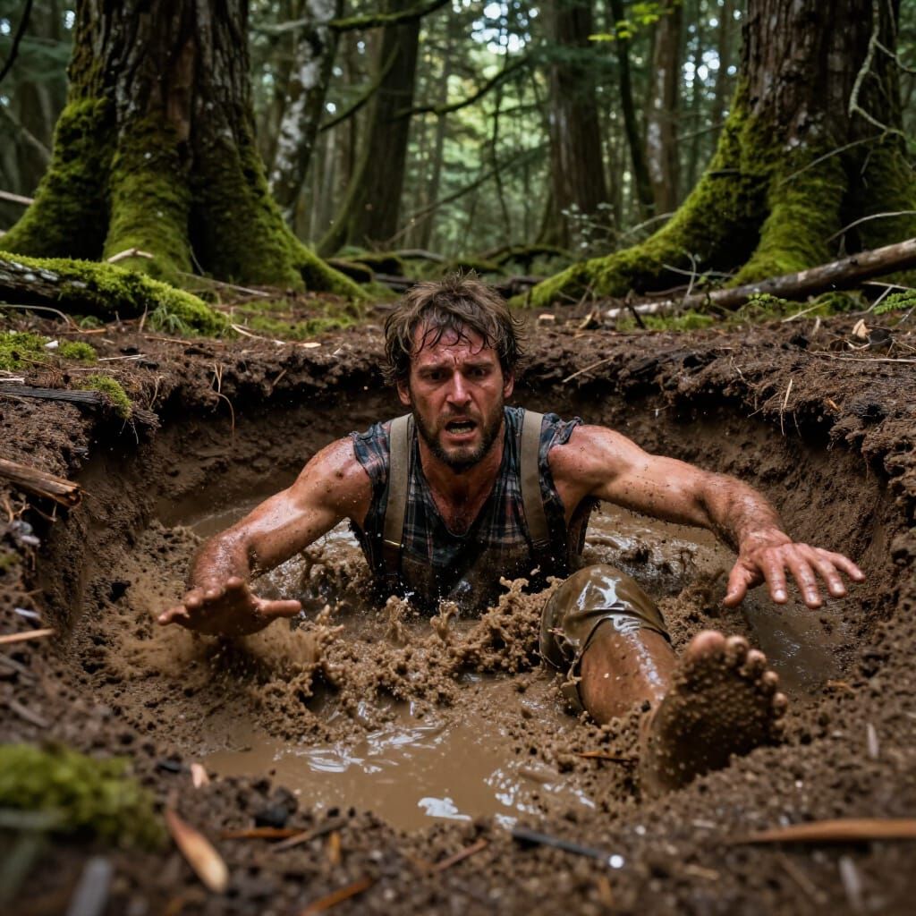 This image shows a hyperrealistic scene of a lumberjack trapped in quicksand, rendered with dramatic lighting and stark contrast, emphasizing fine detail and a desperate struggle.