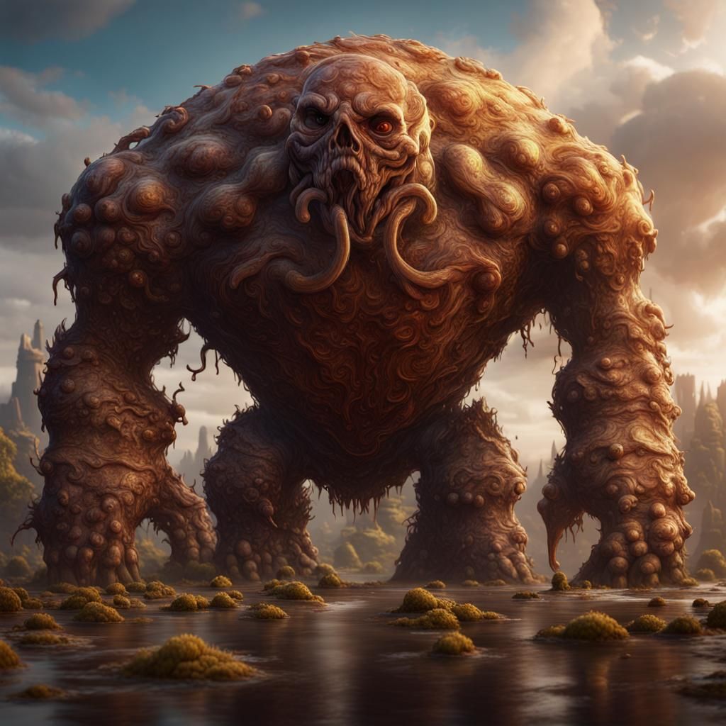 A fantastical digital painting of a custard pie golem. The image features intricate details, deep colors, and complementary color schemes, rendered as fantasy concept art in 8k resolution.