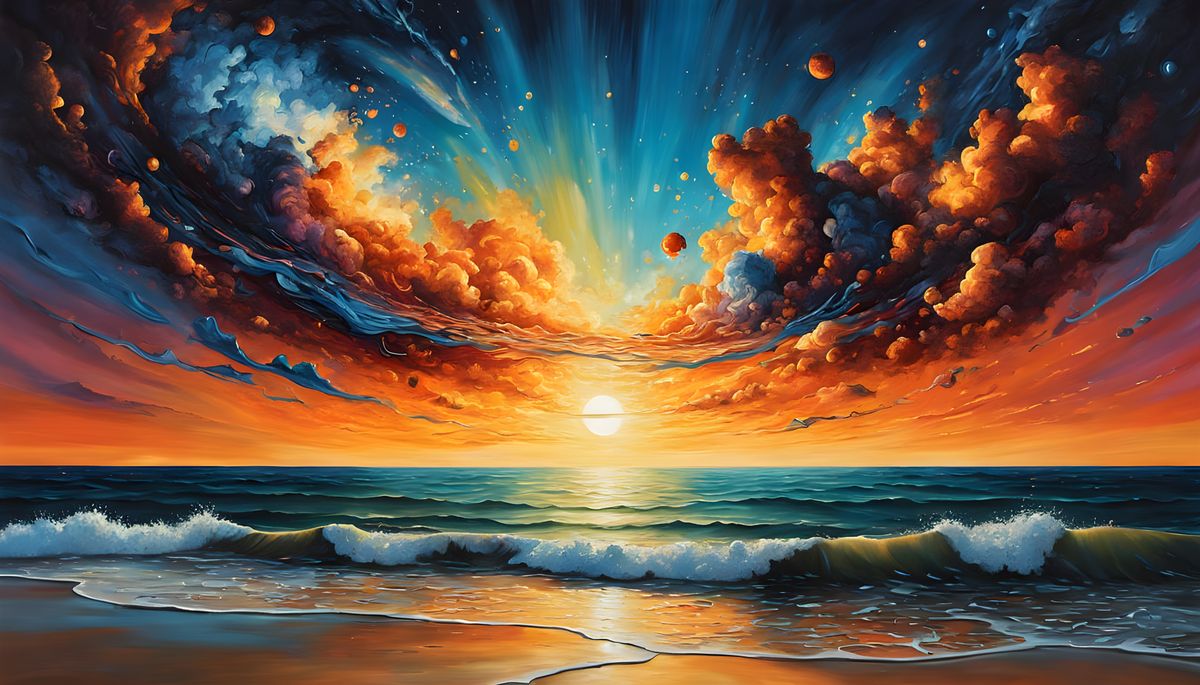A highly detailed collision of galaxies with vibrant hues of green, red, and yellow reflects on a calm sea at night, capturing the essence of Jason de Graaf and Eric Felton's style with its panoramic view and volumetric lighting. The water mirrors the celestial beauty with precision, creating a mesmerizing ...