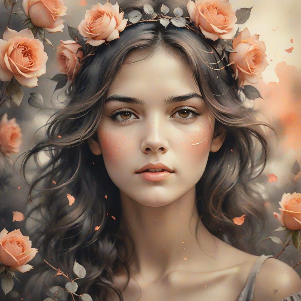 A close-up image of a brunette wearing a crown of roses. The image is in a soft focus, sfumato style, with a faded watercolor texture and warm golden light, rendered as a charcoal aquarelle lithograph.