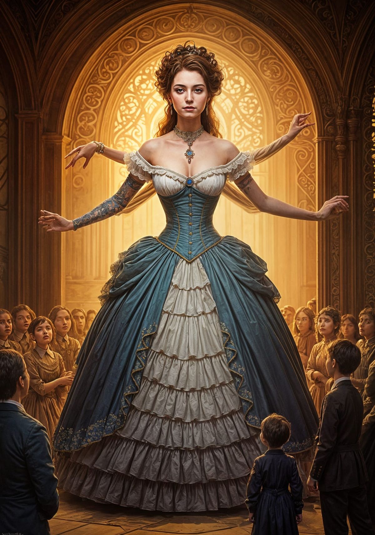 This image shows a woman with extraordinary abilities changing size amidst a crowd of astonished people, set against a backdrop of intricate, golden triangles and vivid colors reminiscent of a fairycore oil painting with extra limbs and precisionist details.