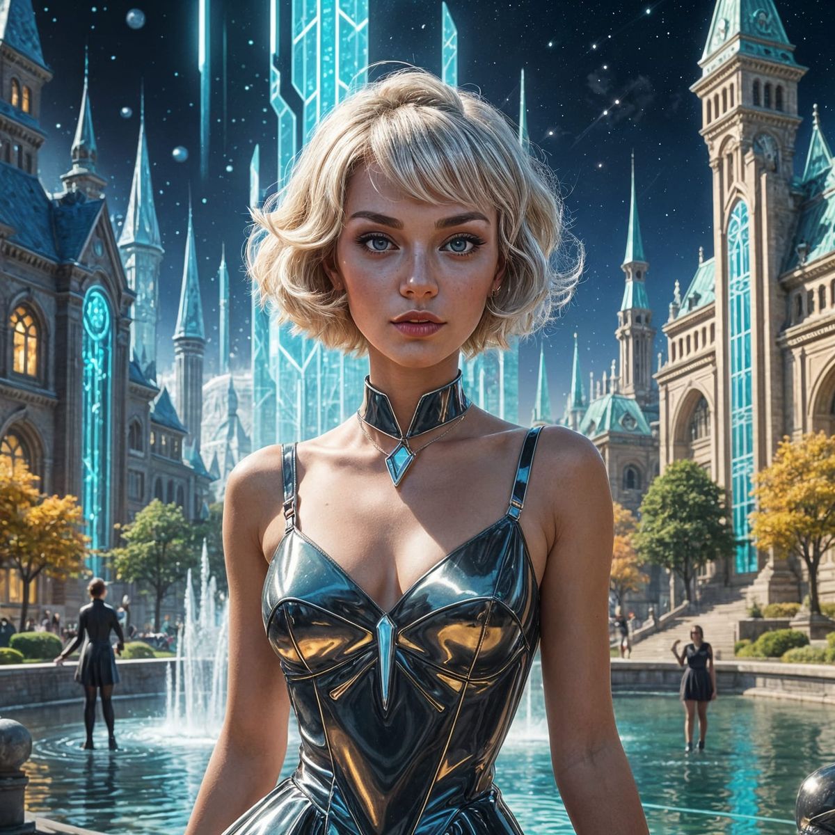A petite woman with a bob haircut sits by a fountain at a magical-technological university. Students, drones, and familiars populate the square beneath crystalline spires.