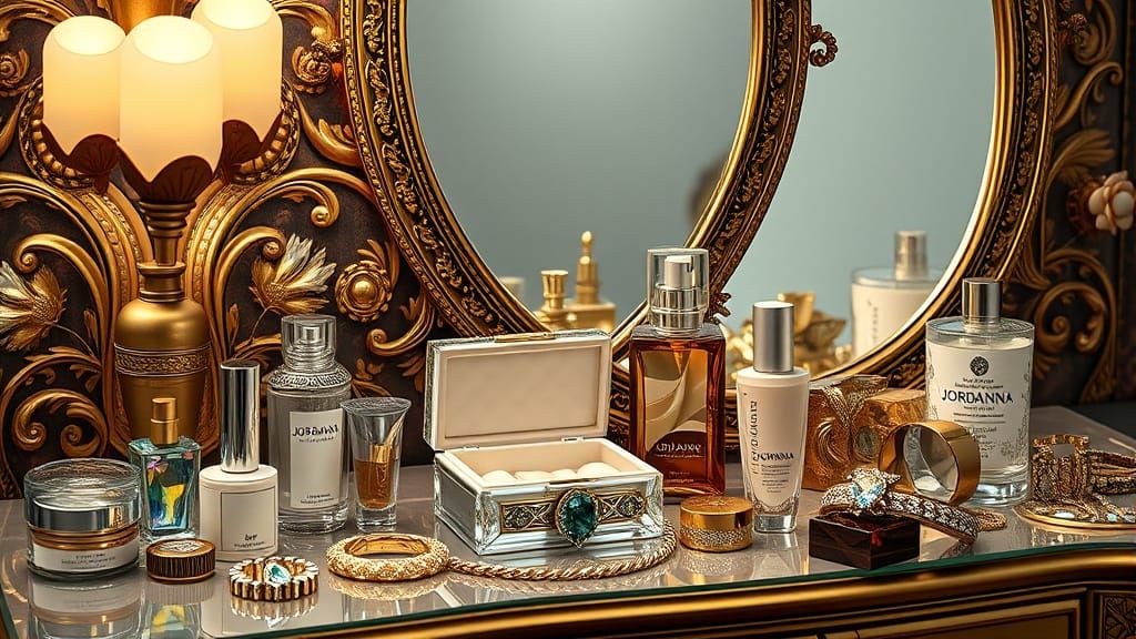 This image showcases a beautiful lady's still life surrounded by luxurious JORDANNA cosmetics, with intricate details and mesmerizing colors, reminiscent of the Art Nouveau style of Alphonse Mucha, Gustav Klimt, and Takashi Murakami.