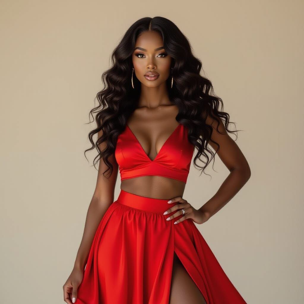 A chic, full-body fashion shot of a young Black woman in a red silk crop top and skirt. Captured with cinematic lighting and a film grain effect for a high-fashion magazine look.