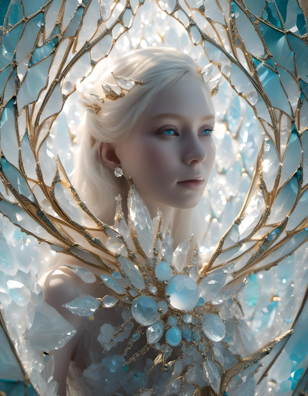 A stunning portrait of an ice spirit imprisoned within a glass city. The artistic design features kintsugi elements, creating a moody, ethereal aesthetic with gold accents and nacreous textures.