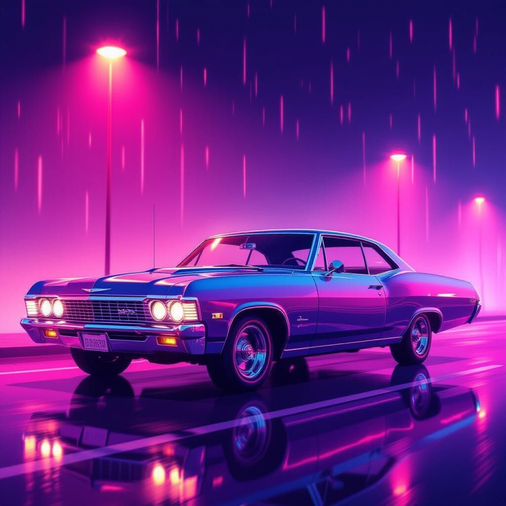 A 1967 Chevrolet Impala captured in a vibrant synthwave style, illuminated by neon pink and electric blue light. Features retro gradients and digital rain effects.