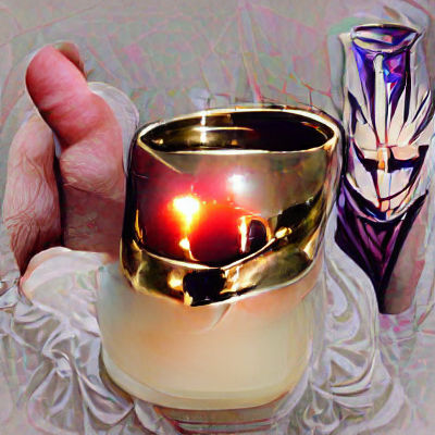 This image shows a hand holding a candle, ring, and cup. The objects are presented in a dark, gothic style, creating a macabre yet romantic atmosphere.
