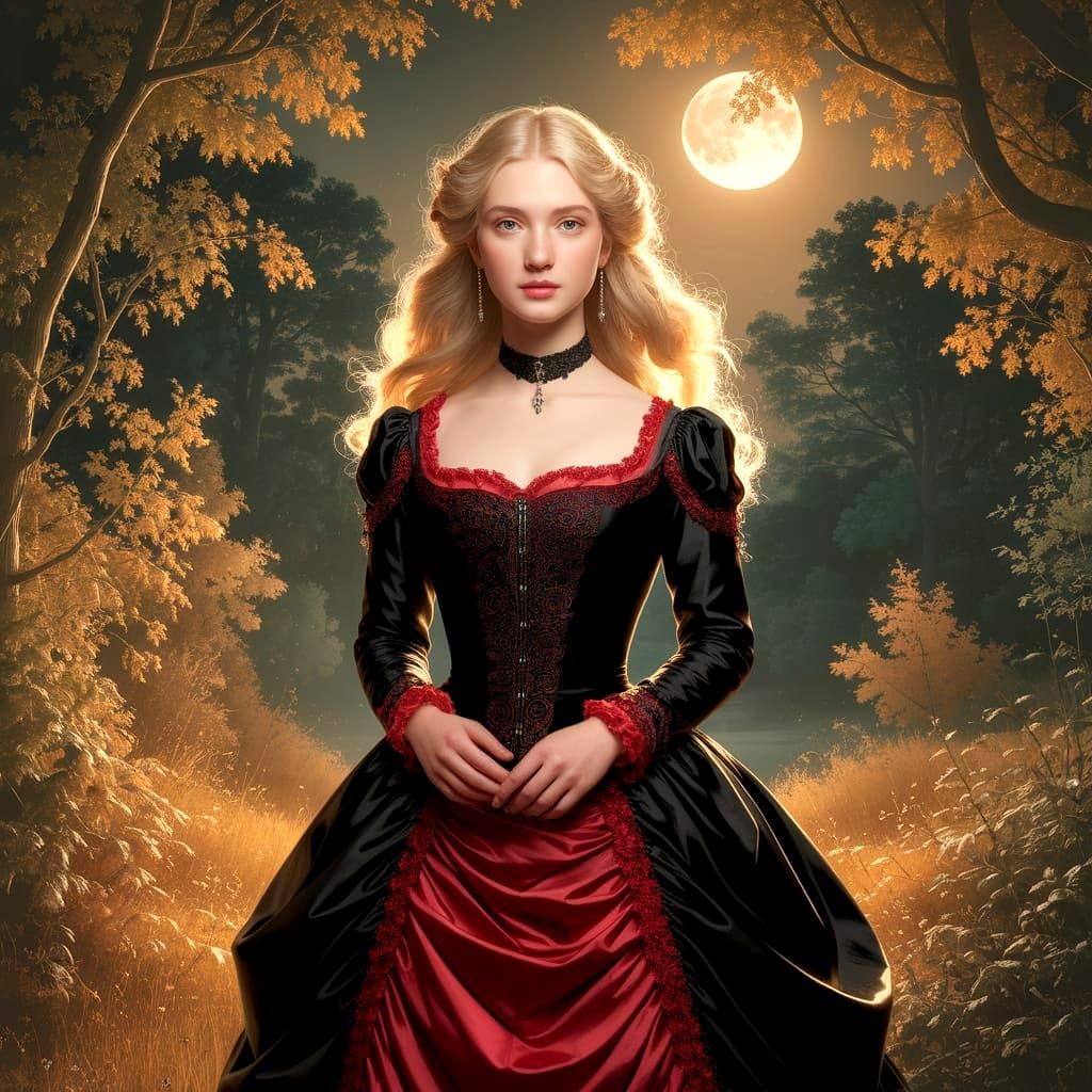 This image shows a beautiful young woman in Victorian attire. She is standing in a moonlit forest, her serene face lit by the soft, ethereal glow in an oil painting style.