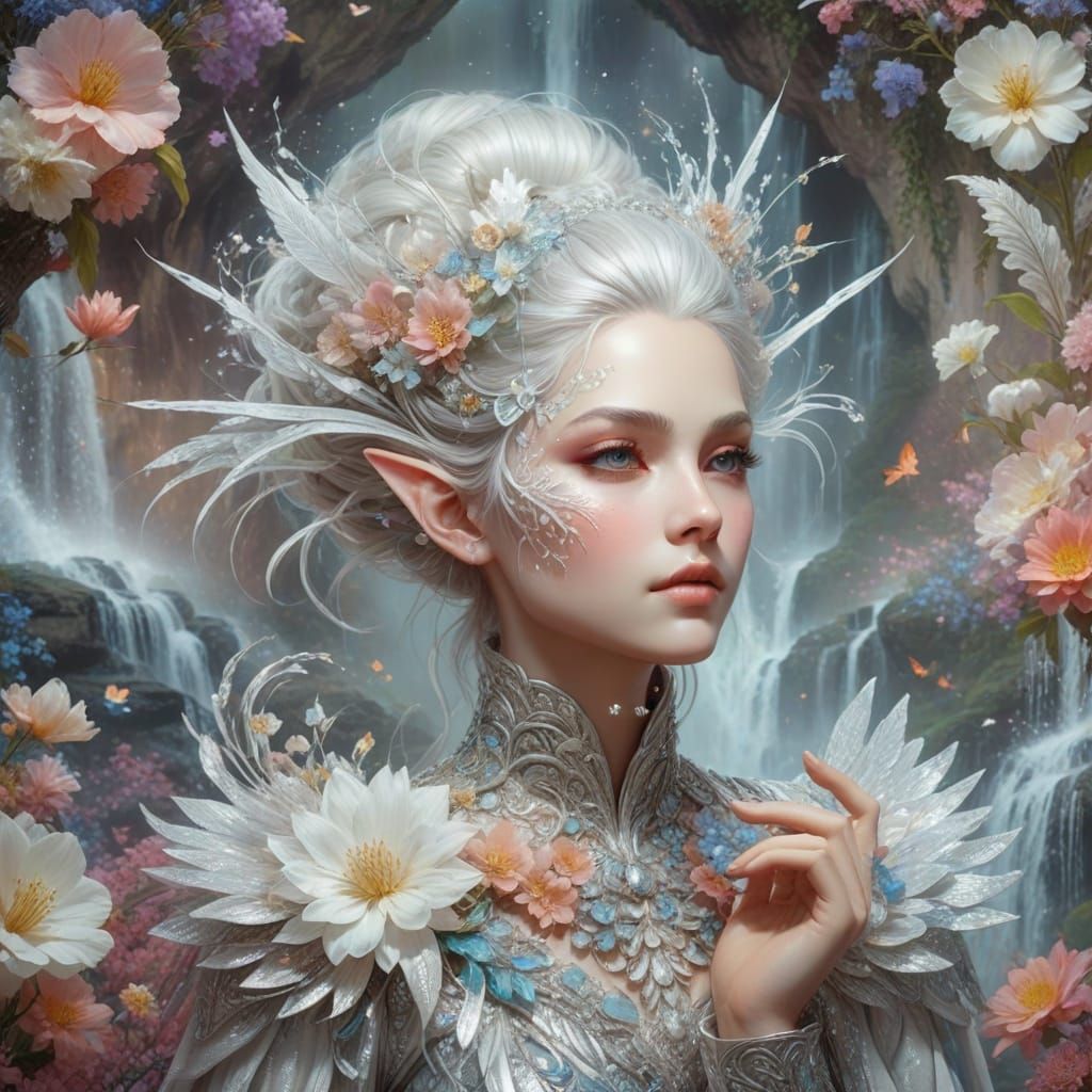 This image shows a semi-shy elf radiating beauty. Her hair is intricately styled with silver threads. She has translucent skin, delicate etchings, and is dressed in vibrant colors, set against a fantasy backdrop. The image is an airbrush art piece.