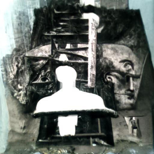 This image shows a surreal depiction of a man's bust with a ladder emerging from his head. The artwork evokes a sinister and thought-provoking atmosphere.