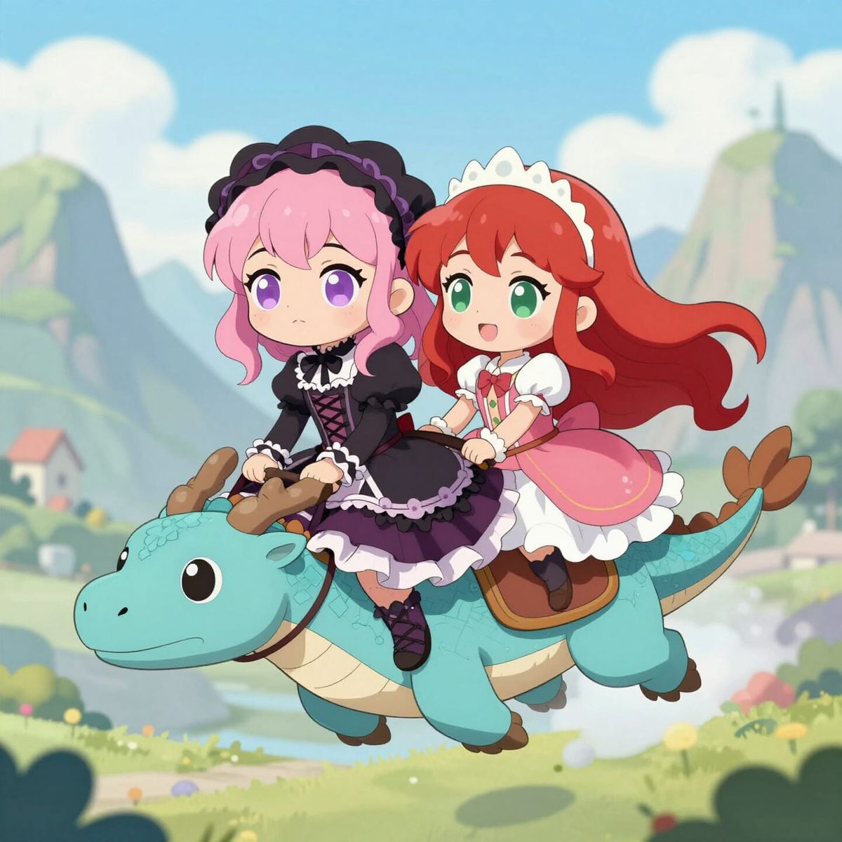 This image shows two cute Chibi women, one Gothic and one a princess, riding a dragon. They are flying through fantasy mountains in a whimsical, manga-inspired style.