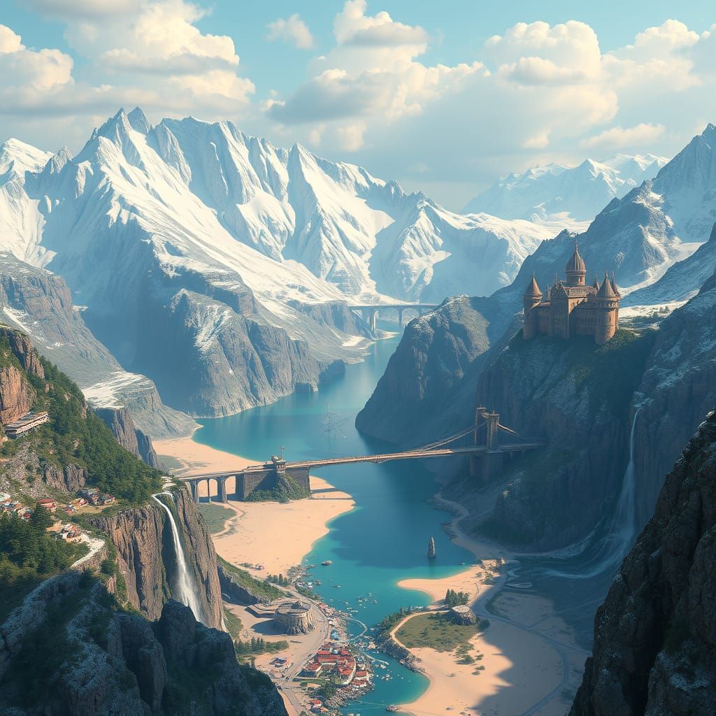 A vibrant landscape transitions from icy peaks to a sandy bay. The scene features waterfalls, villages, castles, and rivers, all rendered in a colourful, fantastical style reminiscent of conceptual art.