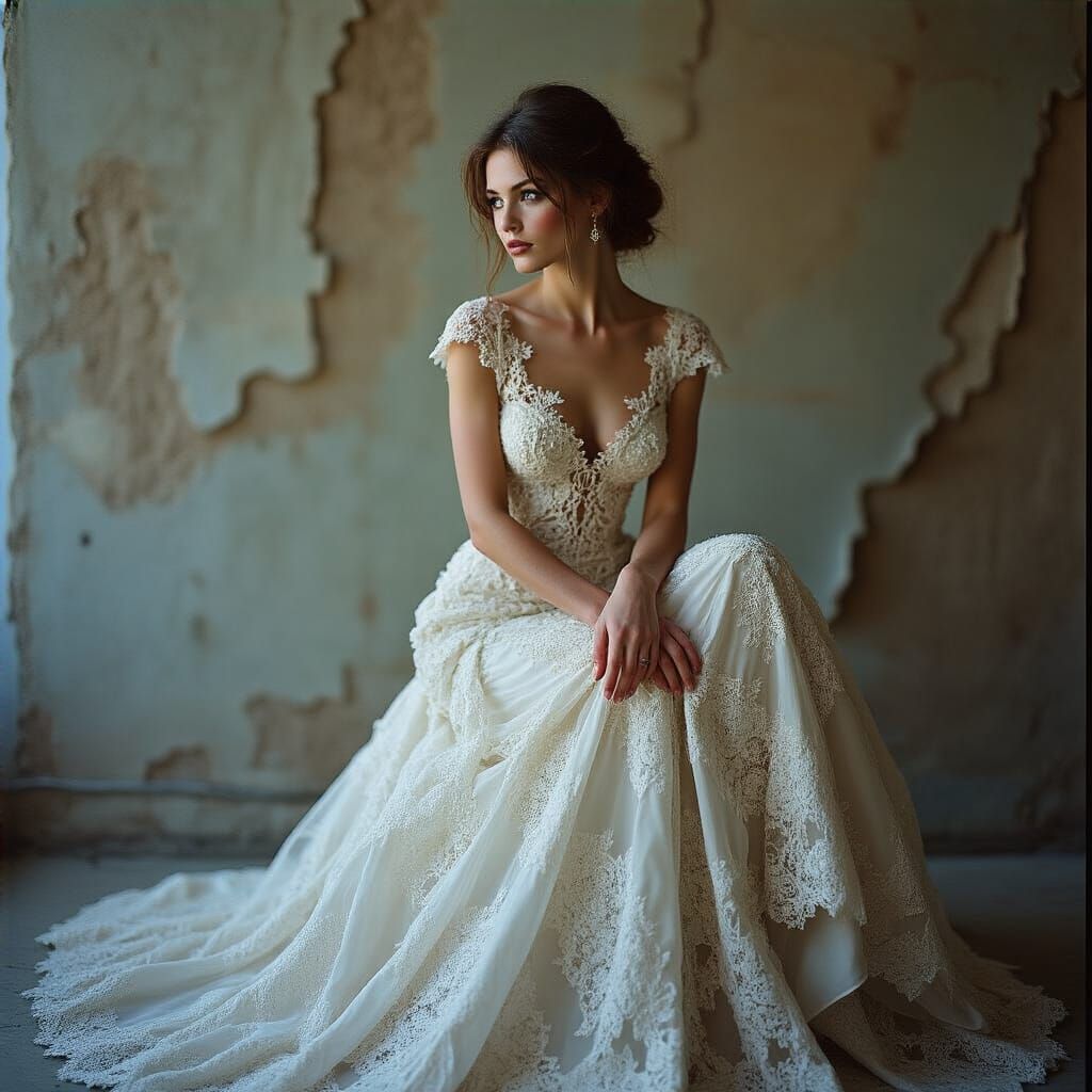 A striking picture of a woman in an elaborate lace wedding dress, photographed in a studio setting. The image evokes a cinematic and film-like quality, reminiscent of classic portraiture.