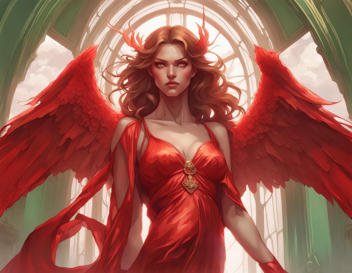 full body shot in soft silk The angel dressed in sheer red stares down at you. She is beautiful but dangerous and you can see it in her green eyes