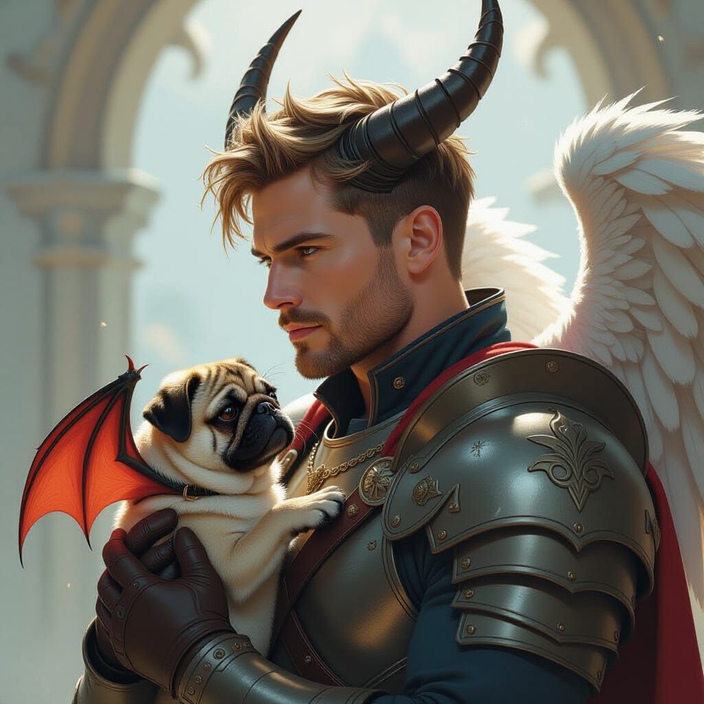 A digital painting of a middle-aged angel knight in profile, holding a bat-winged pug. Hyperrealistic rendering with intricate details and atmospheric lighting create a tender yet striking image.