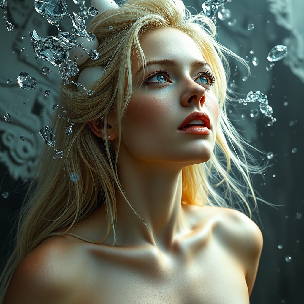 This image shows a beautiful blonde woman, looking surprised. The full-body portrait features intricate details and a matte painting finish, evoking a sense of wonder and imagination.