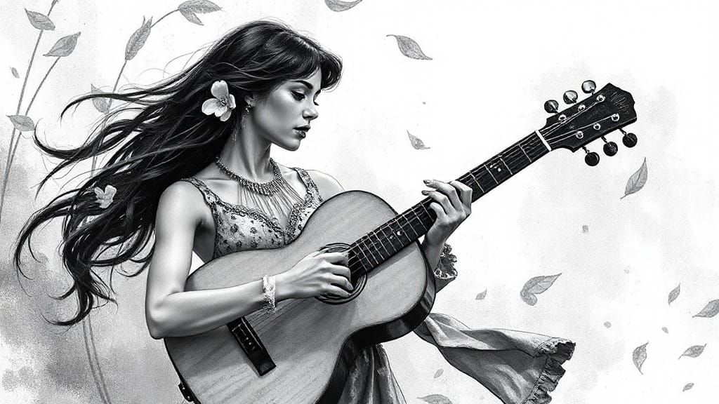 This image is a grayscale sketch of a woman with exceptional musical talent, depicted in a stylized Art Deco and Googie aesthetic with attention to proper anatomy and delicate lines.