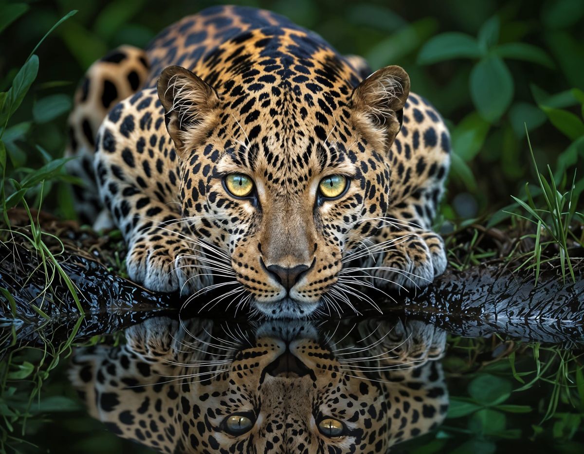 A captivating image of a leopard at a watering hole in a rainforest at night. The animal's golden eyes pierce through the darkness, its reflection visible in the glassy water. A wildlife photograph aesthetic.