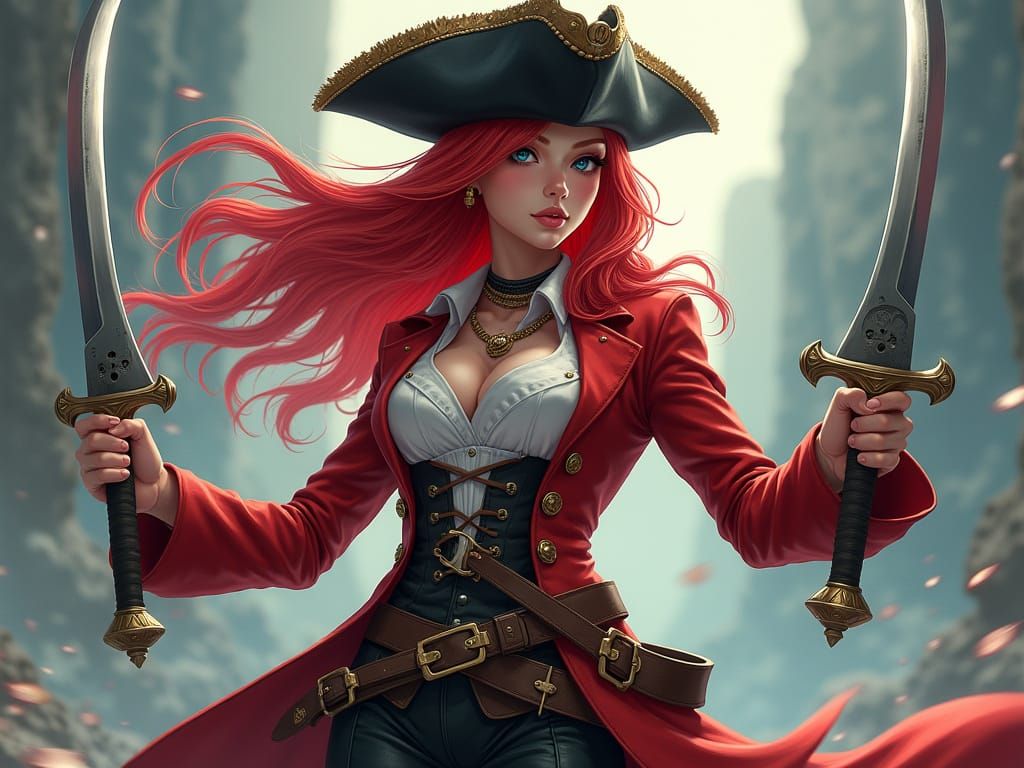 This striking anime-inspired image showcases a slim pirate warrior with a smug expression, wielding cutlasses and sporting long red hair under a tricorn, set against a dramatic backdrop of dynamic composition and cinematic lighting.