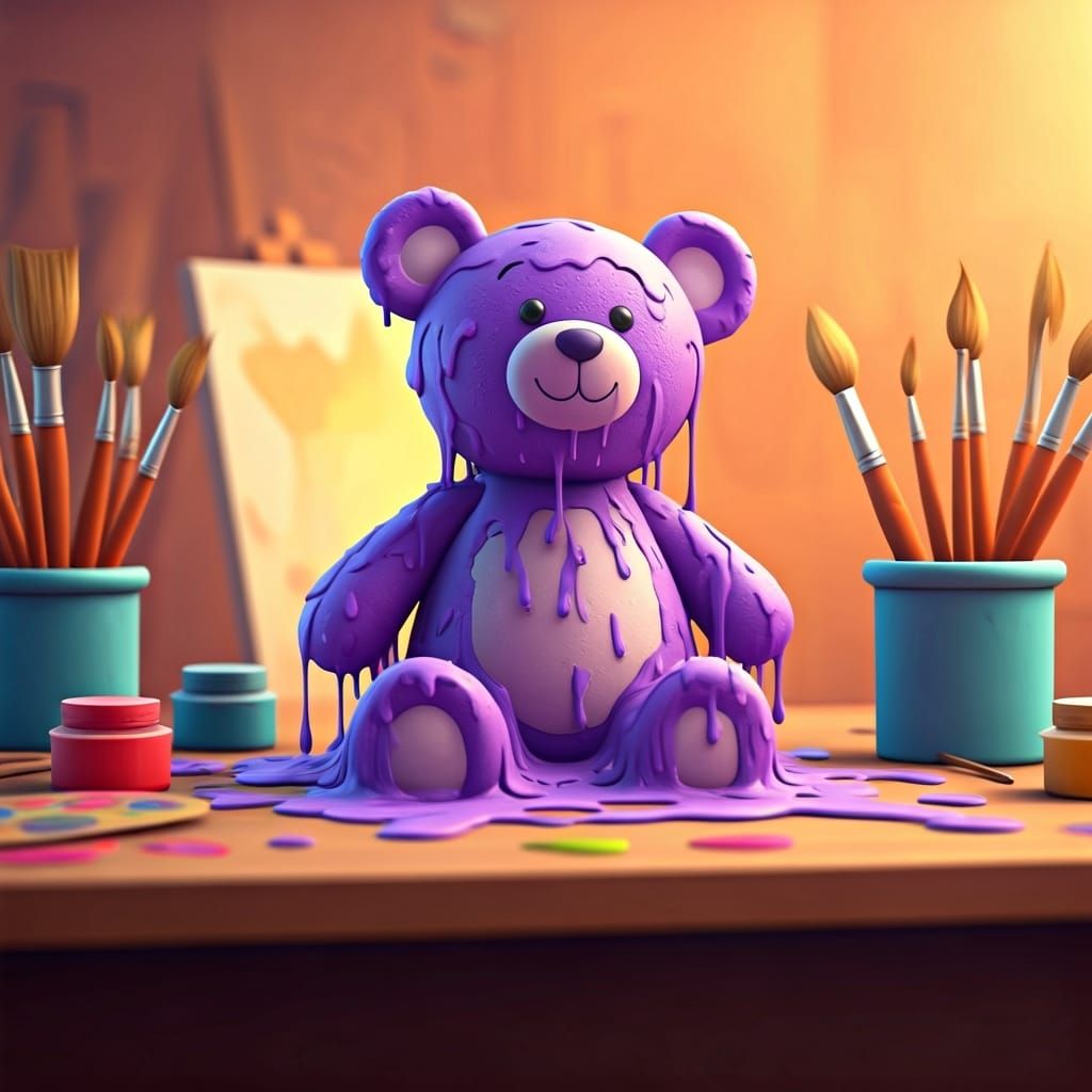 This image shows a purple teddy bear melting in a colorful art studio. The plush toy's surreal transformation is captured with bright colors and rounded forms, as 3D rendered digital art.