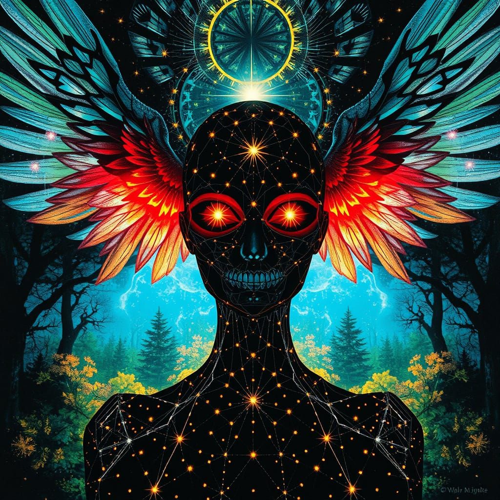 A striking image of an angel of death emerging in a sacred forest cathedral. The figure is rendered with rotoscoping and découpage techniques, showcasing a symmetrical design and electroplated pastel color palette.
