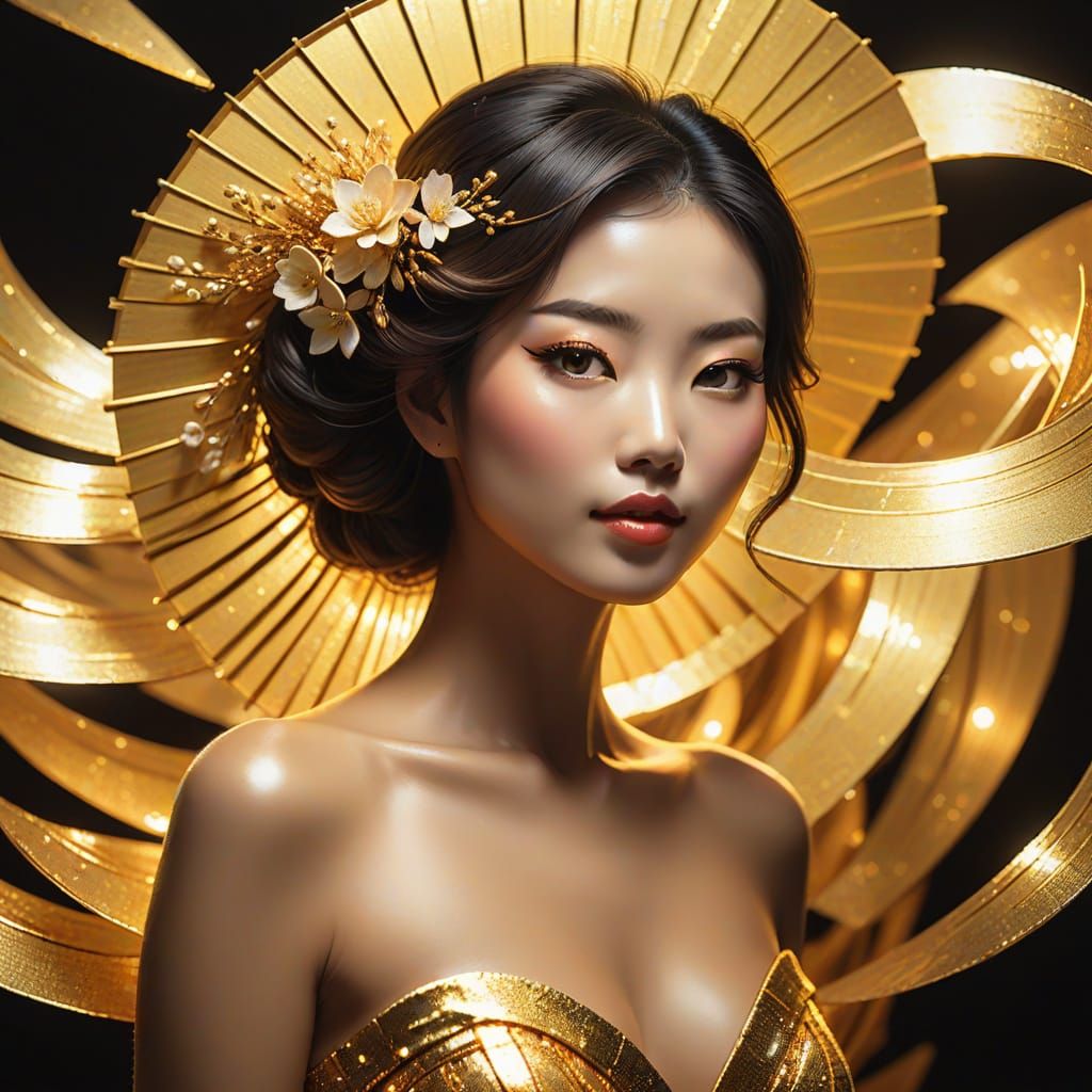 This image shows a serene Japanese woman standing in a warm, golden landscape, showcasing her curvaceous figure and strong arms and legs, with a soft focus and luminous lighting.