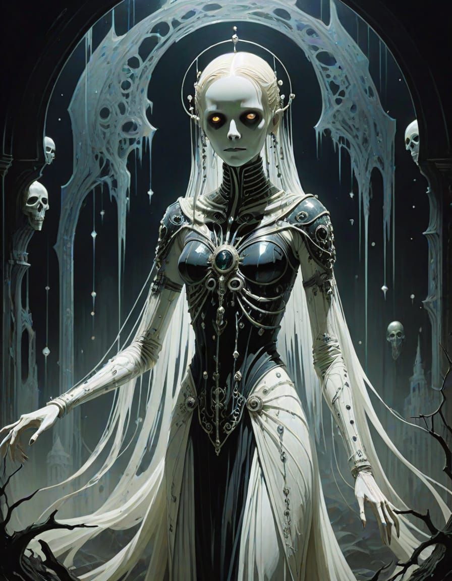 This image features a hauntingly beautiful female figure blending cottagecore and sci-fi elements with a spooky, spiritual impression. A surreal digital art piece.