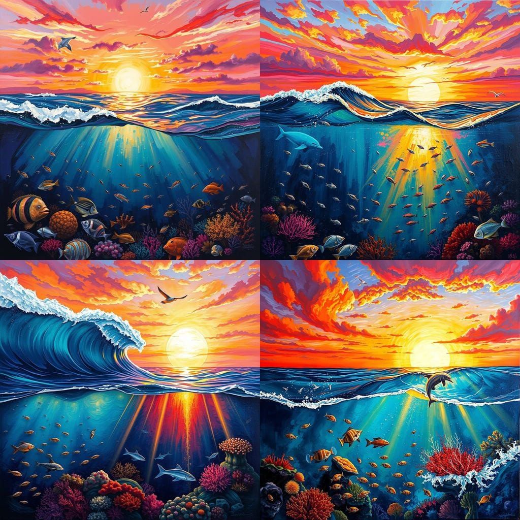 A vibrant oil painting of ocean life at sunset. The image captures the depth of the ocean, from the seafloor to the sky, using impasto techniques and warm colors to convey the scene's energy.