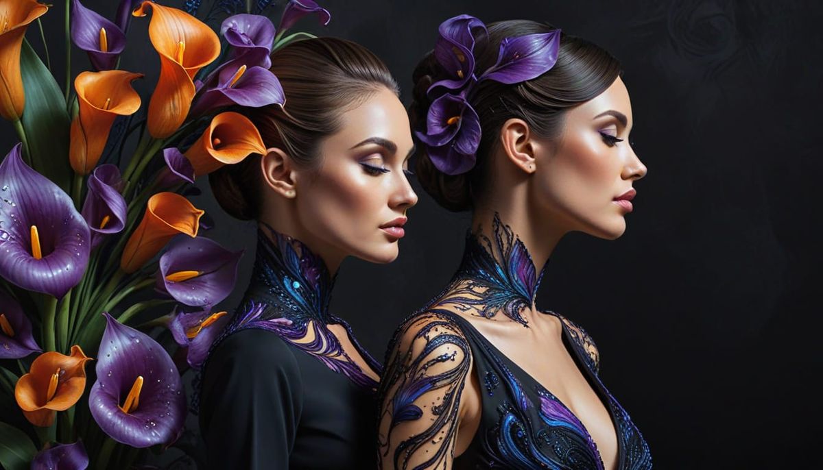This image shows two women integrated with Calla Lily flowers in a photorealistic artwork. The vibrant color palette features purple, orange, and blue hues, creating a mesmerizing visual effect.