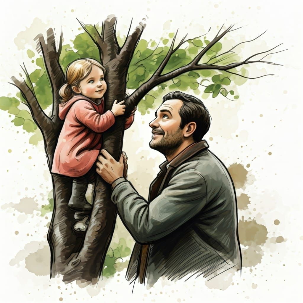 A nostalgic watercolor image of a father watching his daughter climb a tree. The artwork blends charcoal sketch elements with bold lines in a dreamy, heartwarming style.