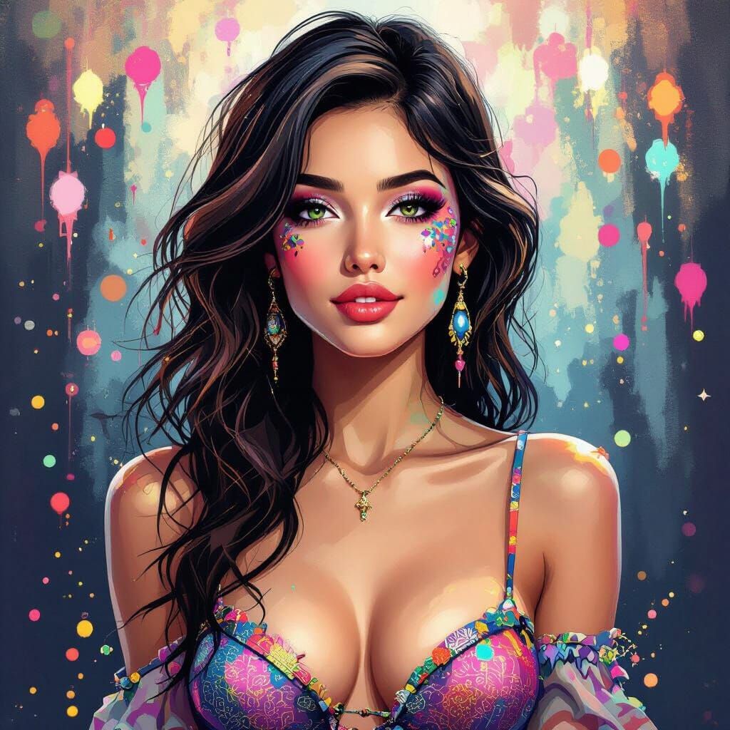 This image shows a hyperrealistic portrait of a woman with vibrant makeup. The artwork uses a pointillist technique to create intricate details and depth against a stark black backdrop.