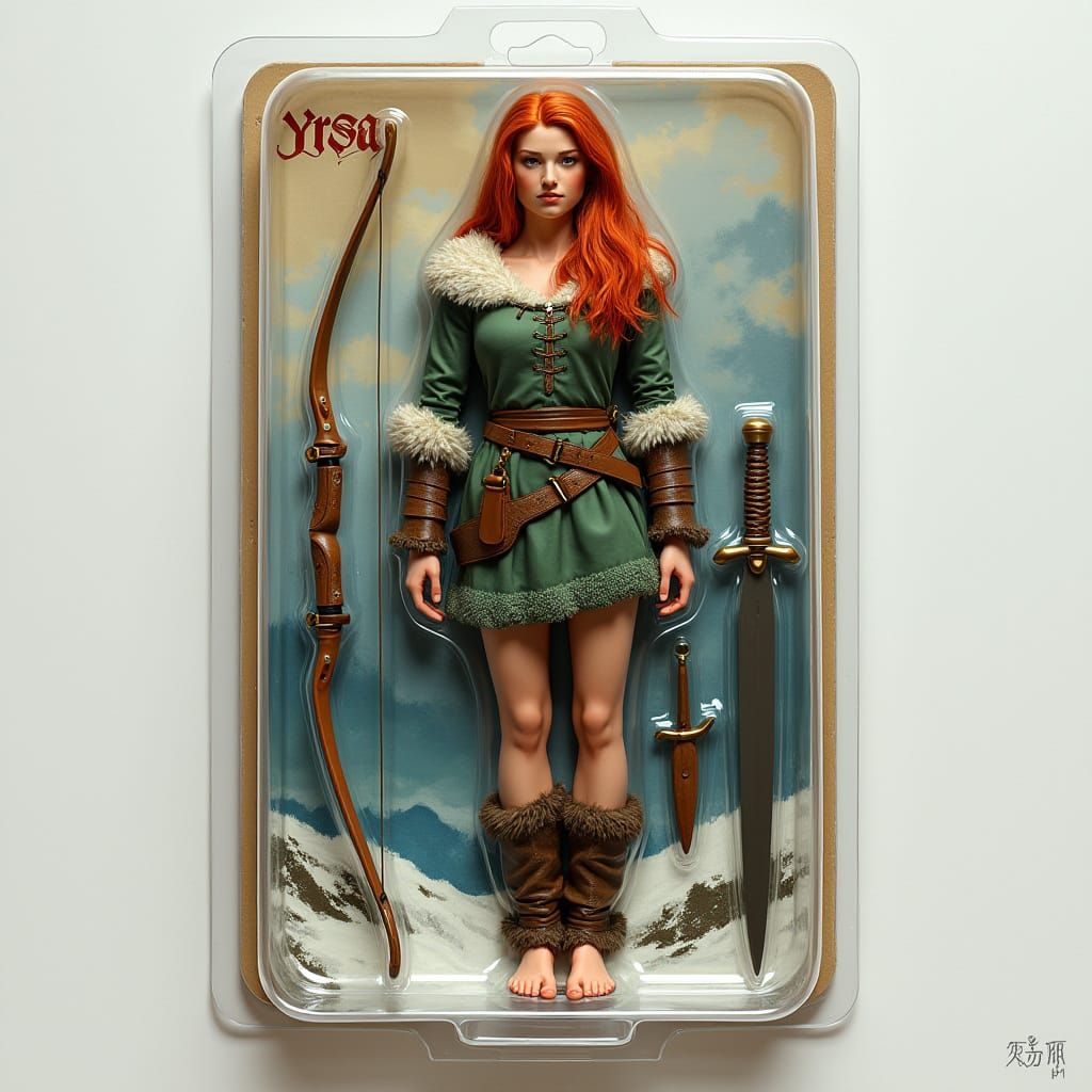 This image shows a highly detailed, photorealistic action figure in a nostalgic 1980s-style blister pack. The figure, a red-haired hunter, is surrounded by a snowy mountain landscape, with a bow, quiver, and dagger at her side, in a style reminiscent of classic action figure packaging and Syd Mead's futu...